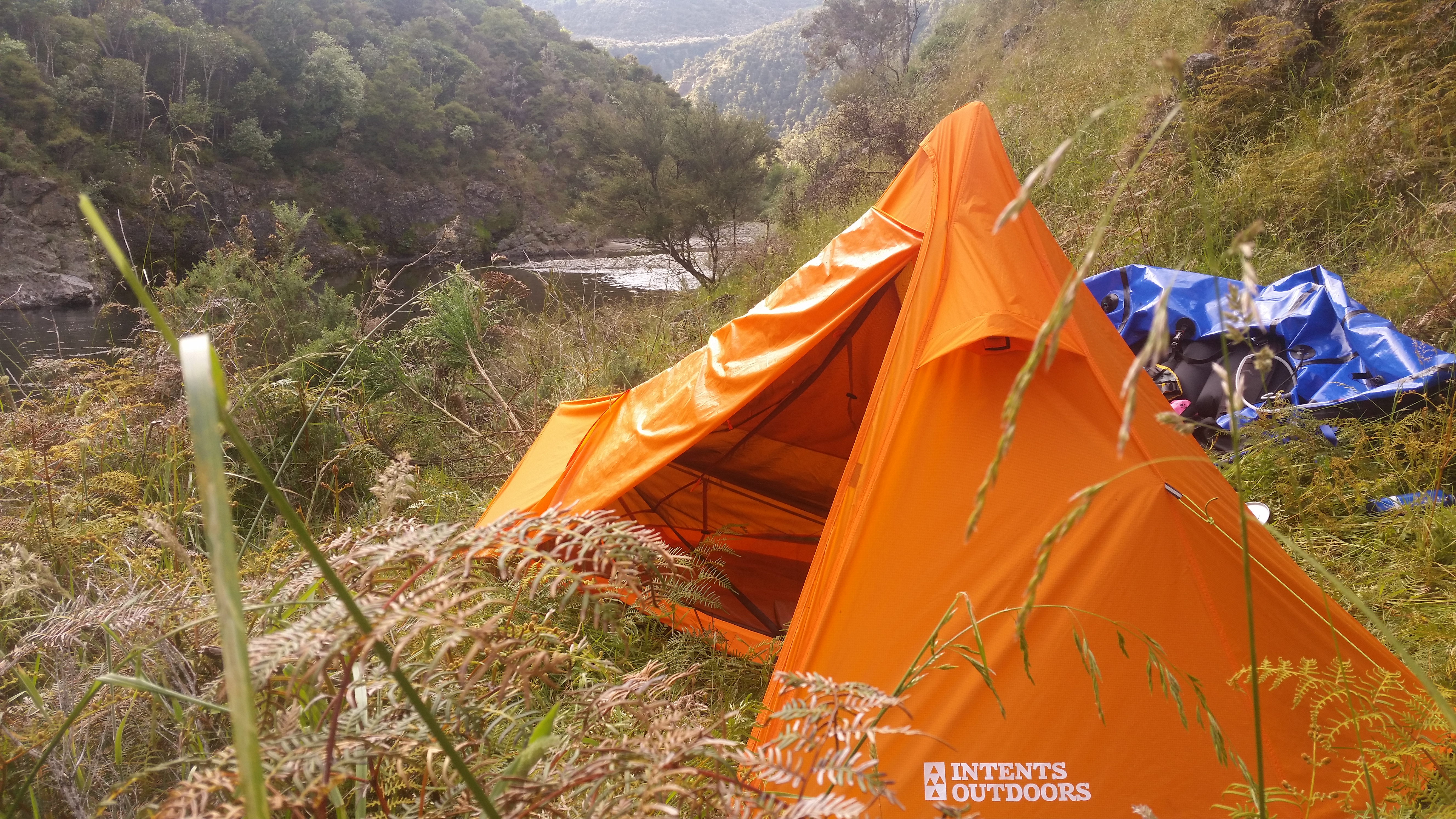 The valley opens out a bit after that, and you pass under Ripia Bridge. (You can takeout here, but the journey back to the start is horrendous). You’re better off paddling through to SH5). After a few more km you’re back into semi-native tree-lined valley, although not quite as picturesque as day-1. It was about 5pm at that stage for us, due to too much mucking around in hotpools, so we found a nice campspot on the grassy riverbank here: BJ38 064 537 (private land, so seek permission first). The next day was a lazy paddle for a couple of hours into relative civilisation. We took out at a nice spot right next to McVicar Rd (BJ38 136 565). Look for a huge log on river-left just before a big horseshoe bend to the right. Scramble up past some blackberries, to a good packup spot, then up to the road.