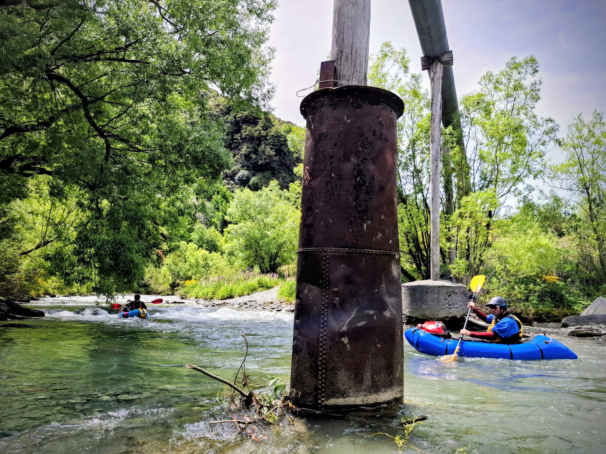 In the Arrow Gorge, the river is generally quite shallow, and snakes its way round tree-lined bends and below large water pipes.