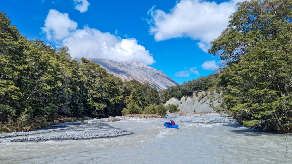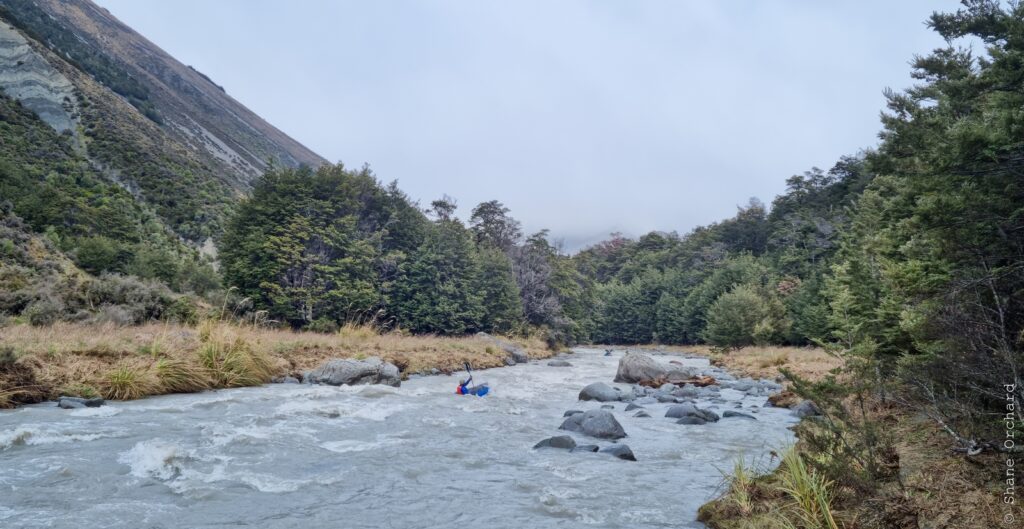 At high flows, the paddling can generally start where Long Creek doubles the flow. Below here, the tramping route is via the river-bed until it resumes on the opposite (true right) side.