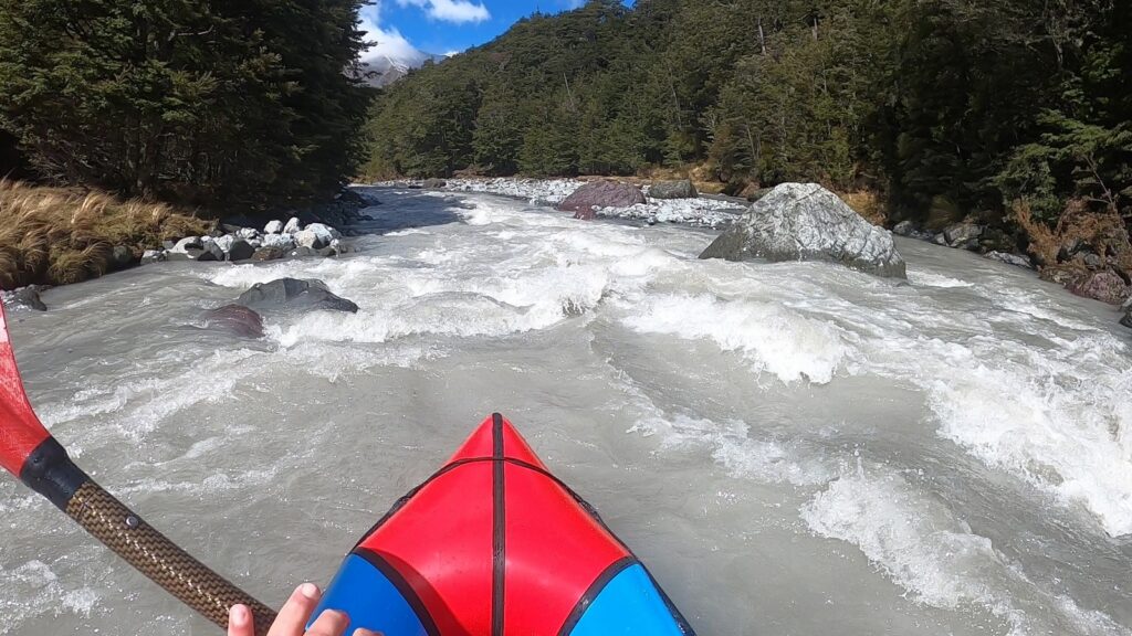 At the flows we observed, the paddleable water generally starts at Long Creek but is initially shallow and fast-moving until the gorge section adjacent to Pt 959 on the Topo50 map. Continuous class II+ / III rapids then become the dominant character, interspersed with some quieter sections.