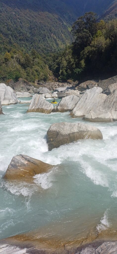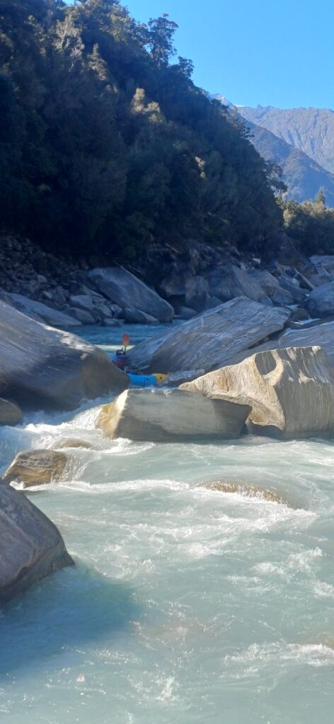 A short bit of easy water below the hut barely lets you warm up your paddling muscles. The action starts very abruptly around Bunker Creek, where you are navigating your way through channels created by giant schist boulders splitting the river. There are some epic boofs and chutes in here but also many sieves. So if in doubt, always scout and don’t miss any eddies! Like we said at the start, you need to be very aware of when things look like they are about to get steeper, which means portaging is probably a wise move.