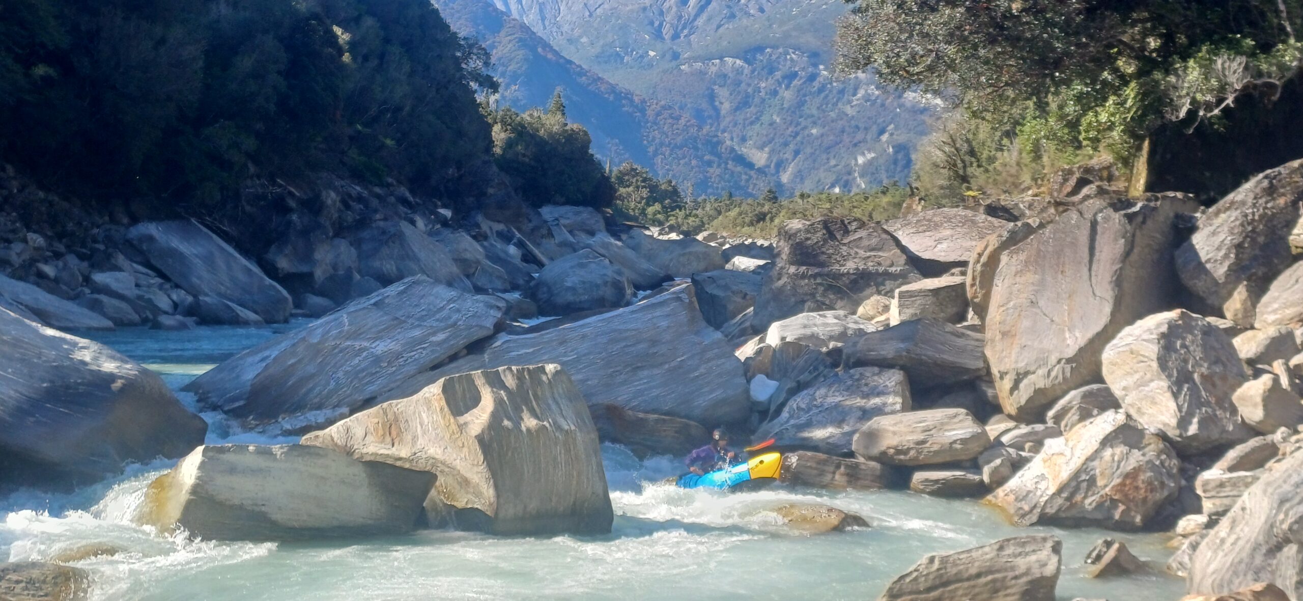 A short bit of easy water below the hut barely lets you warm up your paddling muscles. The action starts very abruptly around Bunker Creek, where you are navigating your way through channels created by giant schist boulders splitting the river. There are some epic boofs and chutes in here but also many sieves. So if in doubt, always scout and don’t miss any eddies! Like we said at the start, you need to be very aware of when things look like they are about to get steeper, which means portaging is probably a wise move.