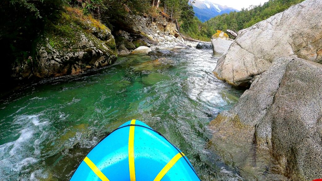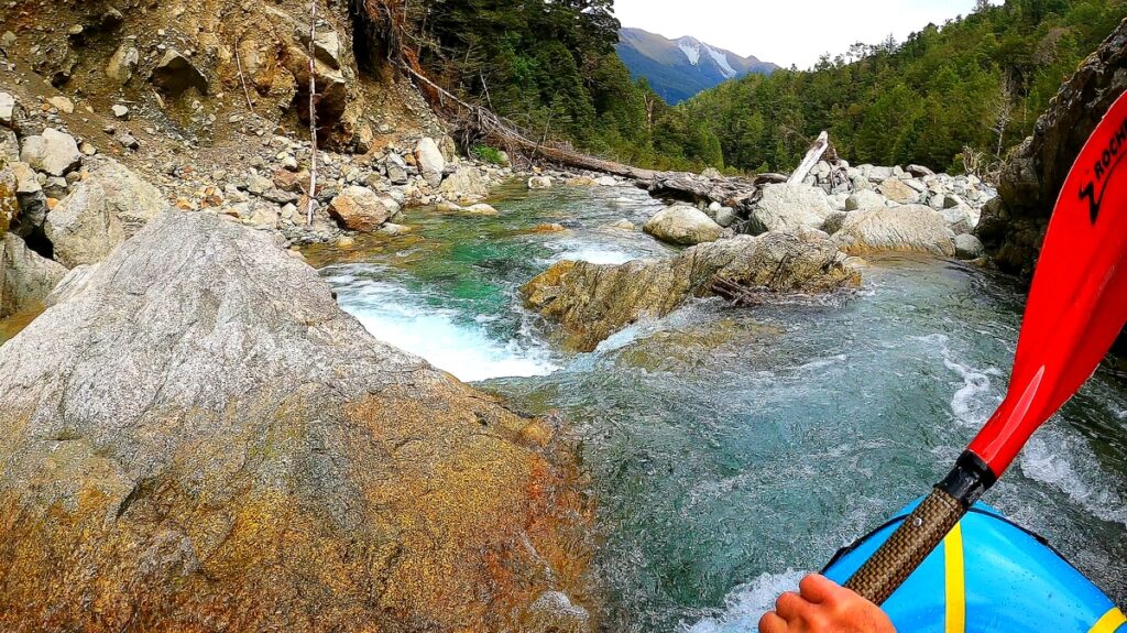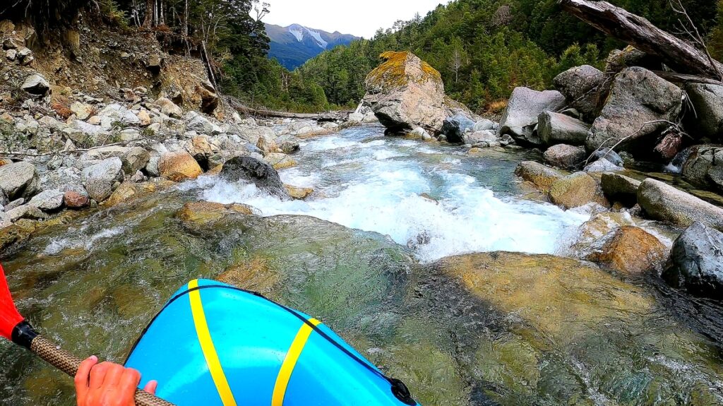 From the ~600m contour put in, the creek has a steep bouldery character that is surprisingly runable and mostly boat scoutable, but it is worth scouting at least the upper few hundred metres from the bank as you walk in. In this upper section you’ll find a nice 4-metre rockslide feature as well as several relatively bony drops. Despite the steep gradient most of the rapids twist through a staircase of small chutes and pools. In lower flows (e.g. just runnable after 1 day of steady rain in Te Anau, as was the case for Shane’s trip) the grade would be III+ but with high flows this would quickly ramp up. Many of the rapids can be seen on the way in and portaging is possible throughout the run.