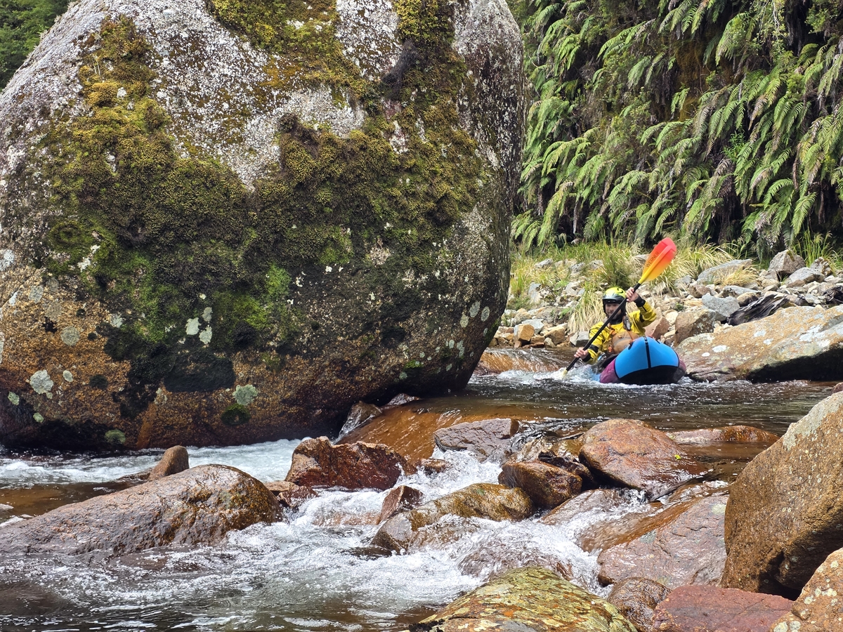The main Mōkihinui has a glowing reputation for paddling (and biking on the Old Ghost Road). The North Branch is more obscure, but is regarded as a great development trip for hard-shell kayakers, who fly in to Johnson Hut. (See the entry on riverguide.co.nz) The North Branch’s character is continuous, with steep boulder gardens through gorgeous granite geology.