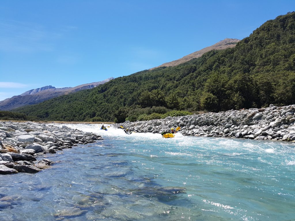 From the Muddy Creek car park, head into the Rees Valley, where you’ll meet Muddy Creek. From there you can either walk straight down the creek to the Rees, or carry on walking easily along the dirt road for 5-10 mins until the road hits the valley floor and put in a short float upstream of the first rapids.