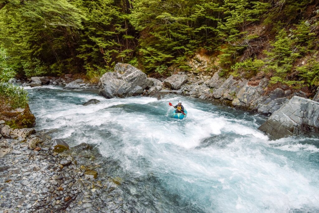 The river then turns to left just as the rock walls widen out. The next steep bouldery drop is the first crux with at least two runnable lines that come together in a powerful jet at the bottom. Catch the eddy below this rapid for a break – this pool is also the place where you can access (or escape) the gorge by scrambling up the bank on the true left.