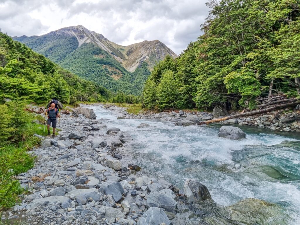 About 2 km from the hut, a prominent slip pushes the route down to the riverbed and a crossing is required. The crossing point is not immediately obvious but choose an appropriate spot towards the tail end of a steep rapid caused by the slip.