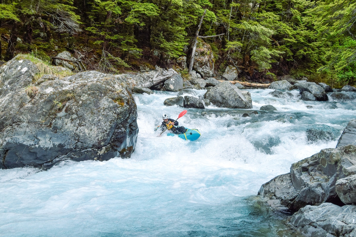 The river then turns to left just as the rock walls widen out. The next steep bouldery drop is the first crux with at least two runnable lines that come together in a powerful jet at the bottom. Catch the eddy below this rapid for a break – this pool is also the place where you can access (or escape) the gorge by scrambling up the bank on the true left.