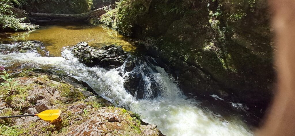 Keep an eye out for where the river drops suddenly over a 1.5m bedrock drop – portage easily on the right, or if you’ve got the water scout and send!
